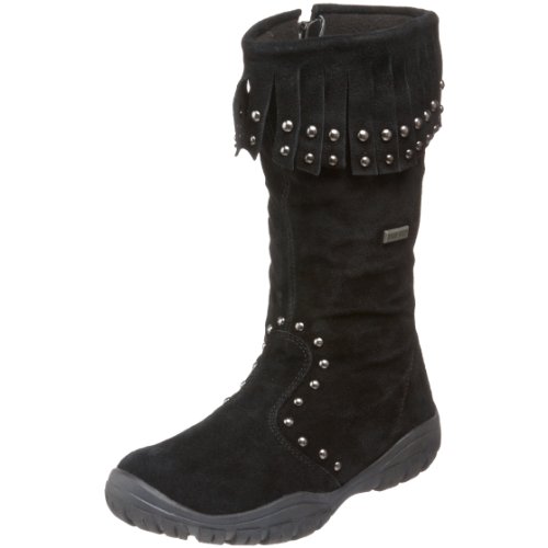 A perfect boot for your budding fashionista, the Rhemes from Naturino also features comforting details that will make you feel good about her wearing it. The suede upper is decorated with metallic studs and fringe detail on the top boot shaft for a style she'll love. The full-length side zipper ensures easy on and off functionality, while the treaded rubber sole keeps her walking steadily.